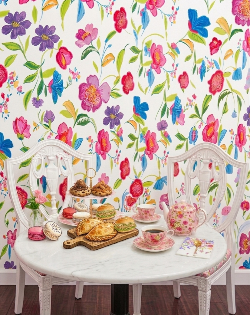 Served in a charming, cozy setting with soft floral touches and pieces from our private china collection โจ